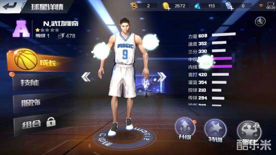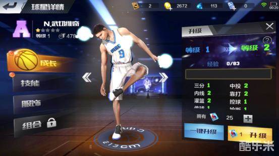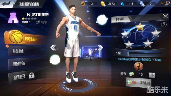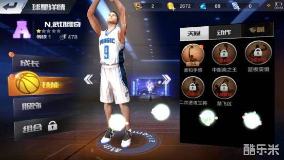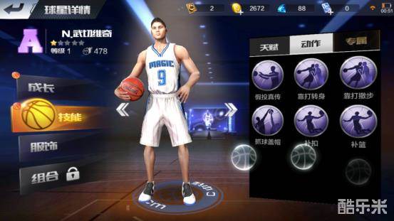 在球星技能页面还可以查看球星支持的《动作》,点信息介绍可以查看演示视频,没事可以多练习一下,有助于上篮得分。