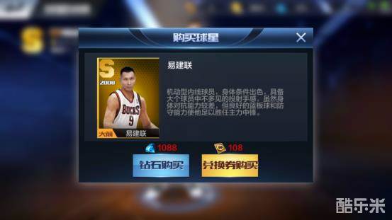 进入商城后点击《球星》选项,进入球星页面,可以点击屏幕上方,用条件筛选自己喜欢位置的球星,例如,点击《大前》选项,系统会展示所有大前位置的球星,在点击球星《易建联》,系统会展示选择球星的详细信息,在该页面中会看到球星的:体能、进攻、防守、稳定、技巧等属性信息,从上述信息可以分析该球星适不适合自己操作,如果适合可以点击屏幕右下角的《购买球星》按钮,点击后会出现支付信息,可以选择用钻石购买,也可以选择用兑换券购买,购买成功后,可以到《球星》系统查看。