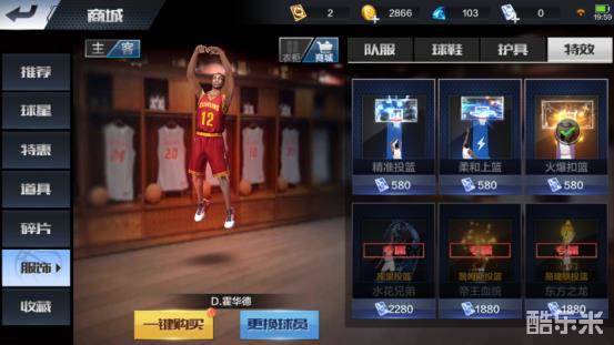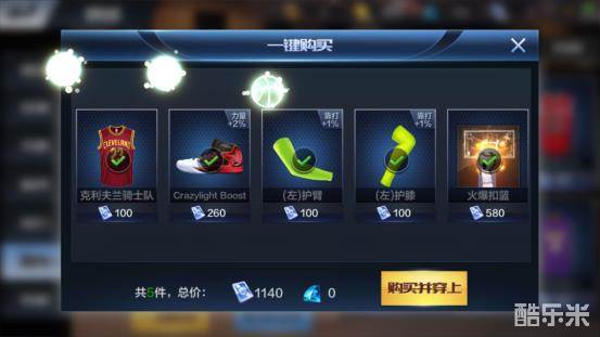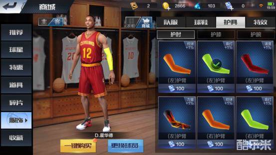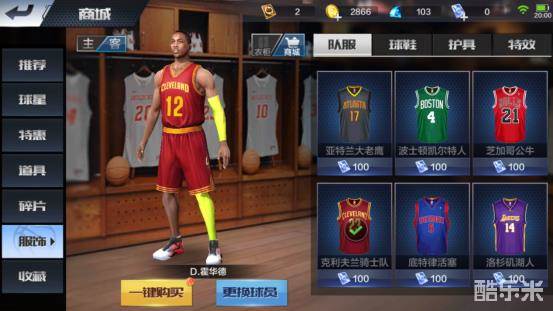 进入商城后点击《服饰》选项,进入服饰商品页面,在页面中我们可以看到:队服、球鞋、护具、特效等选项,如果要为球星选择衣服时,点击《队服》选项,页面会展示各种队服样式,点击自己喜欢的服饰,球星就会穿戴上,还可以搭配其它服饰,点击《球鞋》页面展示球鞋样式,需要注意的是,球鞋是可以增加人物属性的,在选择的时候一定要注意这点,选择适合自己球星的球鞋,球星的特长属性才会更加突出,护具也有属性加成,在选择时同样需要注意,球星服饰搭配完成后是不是该给帅帅的球星来点投篮特效那,点击《特效》选项,进入特效页面,选择自己喜欢的特效进行添加,球星服饰全部选择完成后,点击《y一键购买》会进入支付页面,在该页面中可以看到自己选择的商品和商品数量与商品总价格,如果有不想要的商品,可以点击该商品,这是该商品上面的绿色对号会取消,下方支付总金额也会变化,确认无误后点击《购买并穿上》。