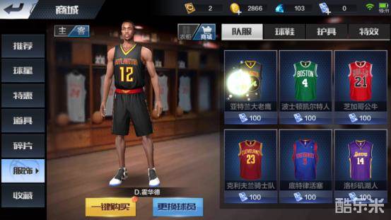 点击左侧《服饰》选项,会进入服饰商品页面,在服饰商品页面可以为自己喜欢的球星搭配自己喜欢的队服或者球鞋、护具、特效等,搭配完成后点击《一键购买》可以支付该球星身上所有服饰商品。