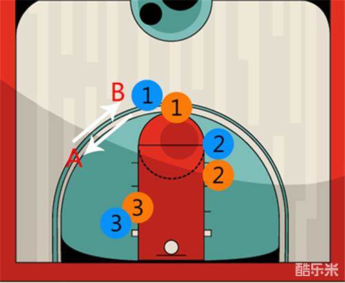 如上图蓝色进攻方1号位SG持球后,将球传给2号位球员,然后使用摆脱向防守空位一侧跑动,当到达A点与防守球员拉开距离后,2号球员迅速将球回传给SG,如果与防守球员拉开的距离比较大,可以直接进行空位3分投篮。如果防守球员跟上来,则可以假投真传骗防守球员跳起盖帽,随后使用摆脱立即反跑回B点。摆脱加上防守球员跳起盖帽,可以让SG赢得空位3分出手的时间差。