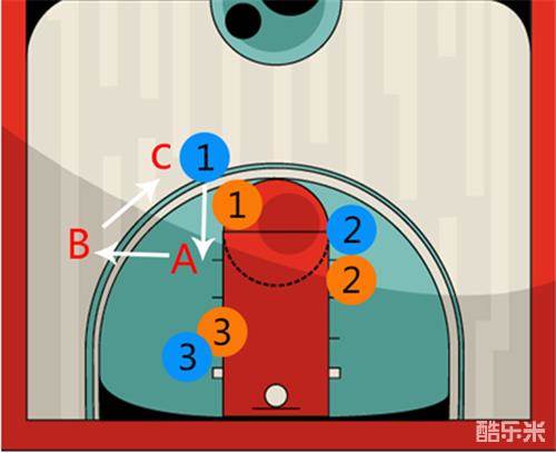 如上图蓝色进攻方1号位SF持球后,首先将球传给2号位,随后自己使用摆脱切入内线A点,随后2号位球员将球回传给SF,SF可以根据情况选择中投。如果防守球员跟进,则可以使用假投真传,随后再使用摆脱跑向距离最近的3分线B点。如果依然未摆脱防守球员,继续使用假投真传后用摆脱,这个时候可以选择跑向3分线C点,或者跑回内线A点中距离跳投。SF是最具动作“欺骗性”的位置,围绕3点跑动进攻战术非常适合SF,可以让对位的防守球员陷入不断盖帽的尴尬处境。