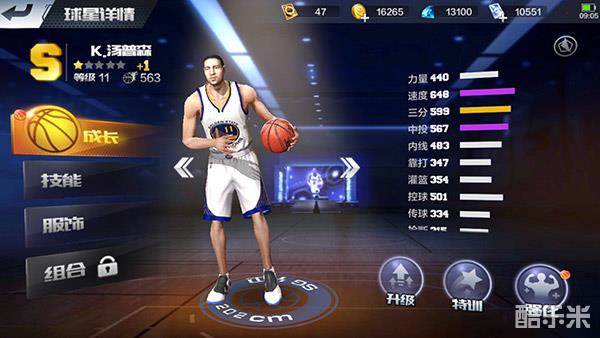 因为这里主要说的是三角进攻,所以并不需要非常全面的球员,比如得分后卫外围投篮精准的汤普森就是一个极佳的选择。汤普森的速度、3分、中投能力是他的强项,搭配内线的无球高位传切和挡拆,就可以发挥他的全部实力。这里注意汤普森的3分能力值,比他的中投能力更高,所以一般进攻可以围绕3分进行。