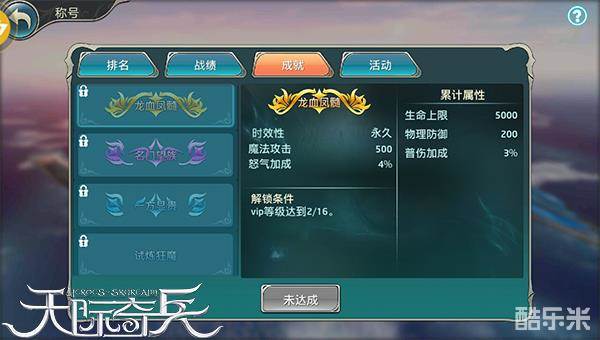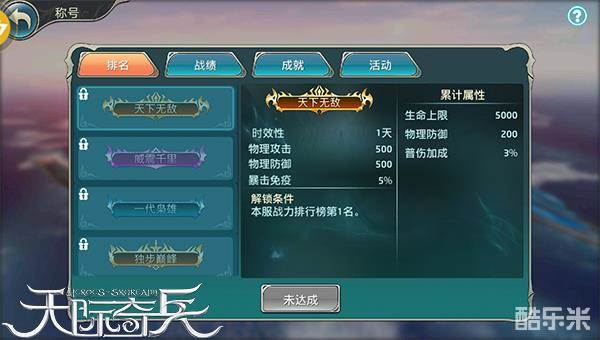 《天际奇兵》称号系统分为排名、战绩、成就、活动4个大类,称号品质从高到低分别为:金/紫/蓝/绿/白,品质越高越难获得,属性越高。