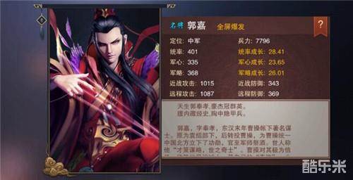 郭嘉作为曹操的重要谋士之一,在官渡之战中起着重要的作用。在郭嘉死后,还有着遗迹定辽东的壮举,被曹操所深切哀悼与怀念。郭嘉作为这五位大将中最容易得到的一位,在玩家群体中非常受欢迎,作为招贤馆中的常客,郭嘉的获得几率非常之高。超高的法术输出能力,搭配全体控制,使得郭嘉兼顾伤害与防御,并且还能削弱敌方的远程防御,在搭配以法师射手为主的阵容时,能够起到奇效。