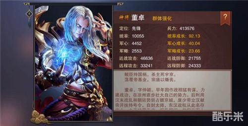 董卓作为吕布的义父,在东汉末年可谓是权倾天下,把持朝政,暴虐非常。在游戏中,董卓同样十分残暴,神将之一的他,自带游戏中最强的单体回复技能,纵祸可以对单体目标造成320%的近战伤害,立即回复造成伤害80%的兵力。董卓在战斗中可谓是越战越勇,尤其是当血量危急的时候,一个大招便能恢复到安全状态,令敌人束手无策。