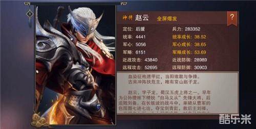 赵云拥有全游戏中最强的资质,在输出方面可谓是无人能够望其项背,论暴力输出,赵云能够达到极致。赵云的核心技能蛟龙出海,能够对全屏的目标刺杀四次,每次造成44%的高额伤害,并且还有高伤害加成以及减伤BUFF,可谓是一举两得。在阵容的搭配上,由于赵云倾向于极端的输出,所以一定要为赵云配备负责防御的武将,只要给赵云一个安稳输出的空间,绝对会让敌人感受到他的恐怖。
