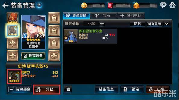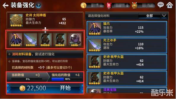 装备强化时使用的材料可以选择5个,可以看到强化后的装备数值,强化装备需要消耗金币,装备最高可以强化至+5,强化至+5后可以升阶装备。