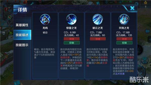 赵云每损失一定比例的最大生命值将获得额外比例的免伤效果,该技能提升了赵云的丝血反杀能力,同时也提升了他的生存能力。