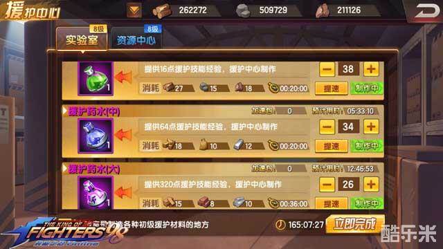 援护技能等级的提升所需要到大量的援护经验药水,援护药水现在分为小、中、大三种,大药水增加的经验最多,需要援护中心的实验室达到7级才能制造,所以要优先升级实验室的等级。在援护技能升品的时候,还需要使用相对应品质的卷轴,不过卷轴的需求量不大,只需要制造少量卷轴即可。