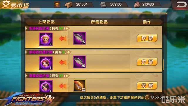 在钓鱼的时候也有几率直接钓到援护之魂,在渔场的交易市场中,桂林山水渔场钓到的紫色鲤鱼和橙色锦鲤也可以直接兑换援护魂,25条紫色鲤鱼可以兑换包子、百合和良的2枚援护之魂,12条橙色的锦鲤可以兑换草薙京和莉安娜的2枚援护之魂。在热带雨林渔场中可以兑换技巧书残页,援护魂和技巧书在两个不同的渔场中,可以根据需求来选择渔场,想要援护魂的就在桂林山水钓鱼,想要技巧书的就在热带雨林钓鱼。