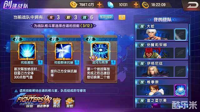 《拳皇98终极之战OL》创世争霸格斗家技能选择技巧