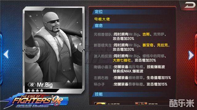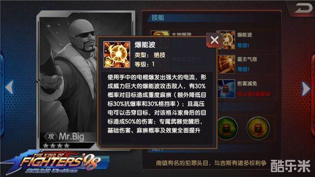与吉斯同队的元祖首领Mr.Big近期霸气登场,使得《拳皇98终极之战OL》又多了一个可以使用雷电麻痹控制敌人的格斗家。Mr.Big有着“电棍大佬”的定位,是一个13资质攻属性的虎魂格斗家,其被动技能可以加强暴八、雷夏和红丸的绝技伤害,因此以Mr.Big为核心组成一套雷电麻痹流阵容。