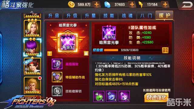 此外,八神庵的景门绝技是可以无视对方的格挡的,而且八神庵、罗伯特、雷之夏尔美、炎之克里斯等老牌13资质的熊魂格斗家碎片是非常容易获取的,可以将里属性中的暴击率和破击率培养到很高的等级,从而更容易克制创世阵容的格挡。
