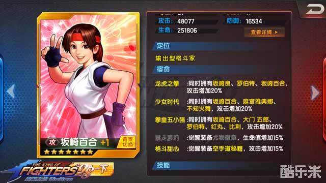 坂崎百合是一个很不错的男性辅助援护,她的援护技能可以给2名男性格斗家增加12%攻击力、20暴击率和20暴击强度。虽然20%的暴击率不与K的绝技暴击率叠加,但是20%的暴击强度对K伤害的提升不是一般的大。K在点满神器和天赋后暴击强度达到60%,在百合援护技能加成后,能达到80%。