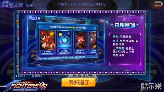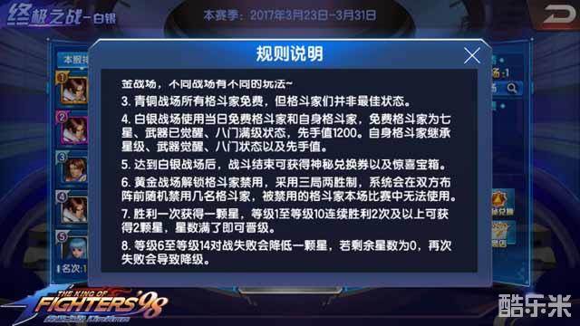 每一局最多可以上阵4名14资质格斗家,白银战场采用三局两胜赛制,每个格斗家不能连续上场,比如草薙京在第一局登场,在第二局的时候就不可以使用草薙京,不过到了第三局时草薙京又可以登场了。所以登场格斗家要至少保证12个主力才行,未拥有的格斗家可以在神秘兑换中使用兑换券雇佣。
