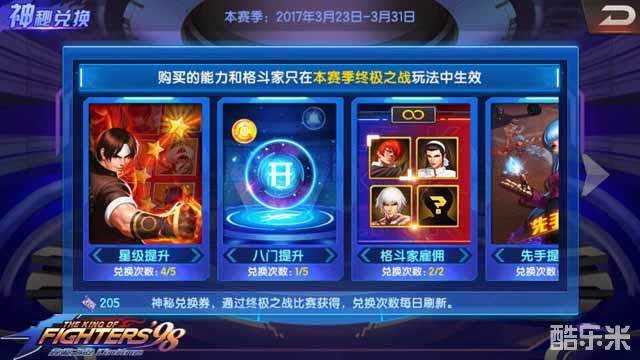 格斗家的星级、八门和先手值都是可以继承的,如果对这些不满意,在神秘兑换中还可以进行格斗家的星级提升、八门提升、先手提升和武器觉醒,从而加强格斗家的作战能力。值得注意的是武器觉醒,如果不觉醒武器的话,是无法激活格斗家的景门绝技的。神秘兑换券可以通过终极之战比赛获得,每天都有提升次数的上限,不要浪费了每天的提升次数。