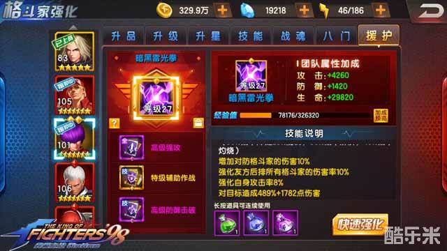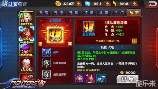 随着《拳皇98终极之战OL》中的援护格斗家数量越来越多,援护技能的等级和品阶培养也越来越高,援护的当前竞技场的格局影响非常大。两个援护位置的格斗家一场战斗可以释放出4次援护技能,造成的伤害是不可忽视的,让援护格斗家作为场下隐藏的输出点成为一种趋势。