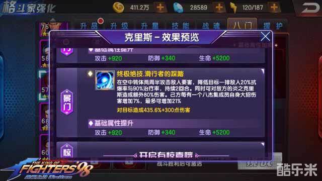 克里斯的小技能和绝技都有降低敌人抗暴率的效果,小技能滑触能够降低敌人20%的抗暴率和80%治疗率,开启八门后下回合小技能释放概率提升30%。绝技滑行者的踩踏能够降低一排敌人20%抗暴率和90%治疗率,场上的八杰集成员越多,绝技伤害加成越高。克里斯的第四技能在开门后还能增加后排5%的暴击强度,克里斯的降低敌人抗暴率可以克制一些缺乏抗暴率的创世阵容,大幅度降低敌人的治疗率让敌人的治疗技能几乎失效。