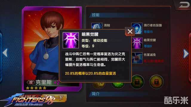 克里斯的第四技能暗黑觉醒是复活,在开启八门后复活改了大幅度增加,克里斯复活后会复活成炎之克里斯,并且会继承当前的怒气。克里斯复活后相当于多了一个更加强大的格斗家,炎克的各项能力还是要强于克里斯的。克里斯是复活流阵容中非常合适的输出,也是少有的能够复活的攻属性格斗家。