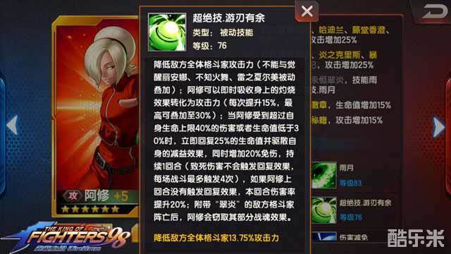 《拳皇98终极之战OL》即将迎来阿修的第二次限时活动,经过两次限时活动后的阿修培养程度更加完善,而阿修的八门四门也已经开放,开启四门的阿修战斗能力再次得到提升。大多数人的阿修都是在后排进行输出,而作为15资质的阿修在前排是否可行呢,让我们来分析一下。
