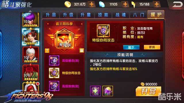 在援护格斗家释放援护技能时,第二本援护技巧书能给场上的格斗家有增益状态,攻属性格斗家的技巧书是特级协同攻击,技属性格斗家的技巧书是特级辅助作战。这两本技巧书的效果分别增加后排格斗家的攻击力和伤害率,而阿修的第四技能吸收灼烧能够增加攻击力,没有触发回血时能够增加伤害率,阿修的增益状态与这两本技巧书不会叠加,只能是取最大值,如果阿修在后排的话,对这两本援护技巧书的增益效果是很浪费的。