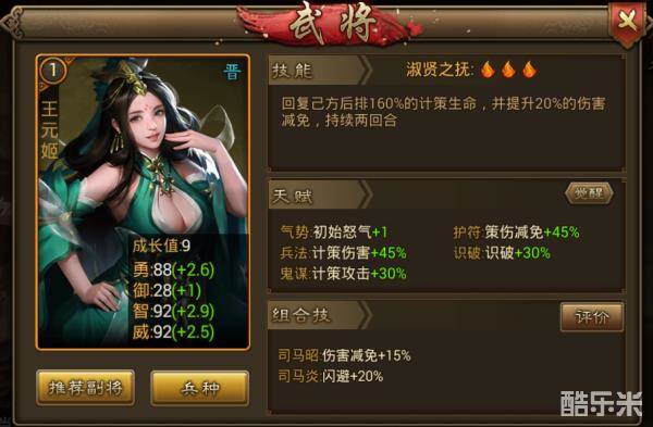 晋武将们普遍防御值相对比较低,但这对恩爱夫妻组合可以减免大量伤害,十分耐打。司马昭发动技能可以对敌方后排造成300%的计策伤害,真是又肉又输出。王元姬的技能是给后排回血,还提升20%的伤害减免,啥也别说了,后排小伙伴请抱紧文明皇后娘娘大腿!