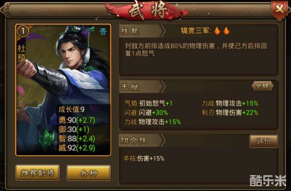 两位伐吴大将走到一起就是要搞事情哦!羊祜技能对敌方全体造成240%的计策伤害,令自身暴击率提升至100%,持续2回合,这是清屏的节奏啊!就算有一两个侥幸存活的,两回合的暴击也让你躲得过初一躲不过十五。杜预犒赏三军对敌方前排造成伤害,并给自家后排加怒,五怒才释放技能的羊祜会爱死他吧!
