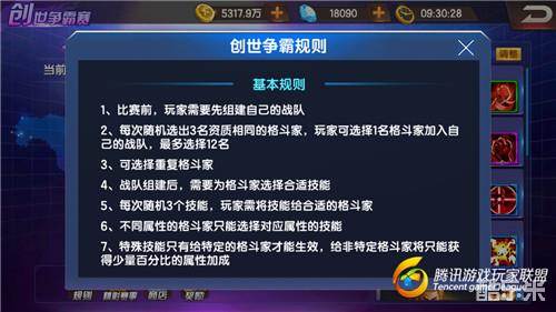 虽然战队有12名格斗家,但是比赛时候只会随机抽取八个格斗家参加比赛。战斗跟巅峰对决实时战斗的模式是一样的,每次上阵四个格斗家,将对方场上所有格斗家打败或将对方所有格斗家打败均可获得胜利。