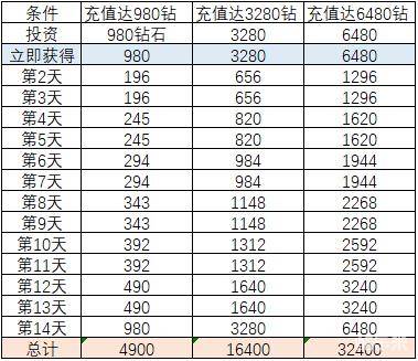 2. 投资后即可连续15天每天领取高额绑钻,共计6倍返利!投资分为“980、3280、6480”三档