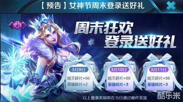 王者荣耀于近期上线的若干活动中要属新年许愿最良心,只要参与的玩家都能免费获得永久英雄或皮肤,而其它活动基本都与头像框和新皮肤有关,导致部分玩家觉得不够给力,为此官方在女神节为大家准备了一个轻松获取的福利—周末狂欢登录送好礼: