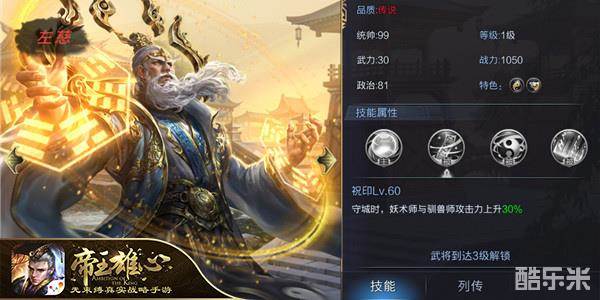 《帝王雄心》手游中玩家可以安排武将守城,选择合适的武将可以使你的城池易守难攻,固若金汤。以左慈为例,其被动技能祝印效果为增加守城时妖术师与驯兽师攻击力,极大增强守城部队的战斗力,而被动技能神鬼之力,可以减少被掠夺时的资源损失,一级技能就可减少60%。刘备也非常适合守城,在守城时刘备可以增加资源产量,以及提升部队招募速度。除了左慈和刘备,还有很多武将可以提升守城效果,各位主公可按照实际需求自行选择。