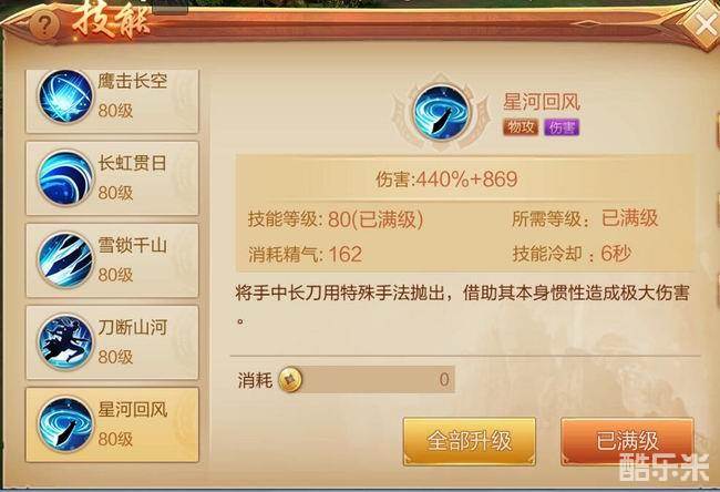 狂刀伤害最高的技能为“星河回风”,80级有440%+869的伤害,所有技能中排第一。其技能表现效果是将长刀丢出后接住,类似回旋镖。虽然伤害很高,但“星河回风”的弊端也是显而易见的,因为从释放技能到刀回到手中这个过程中,你是无法移动的!因此最好在敌人被控时使用。