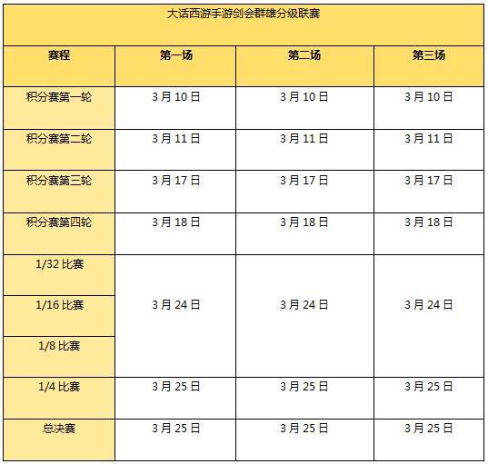e.半决赛:第三周周日举行,不同的组别开始时间段各不相同,【闯荡江湖】组14点开始,【纵横武林】组16点开始,【逍遥三界】组19点开始;