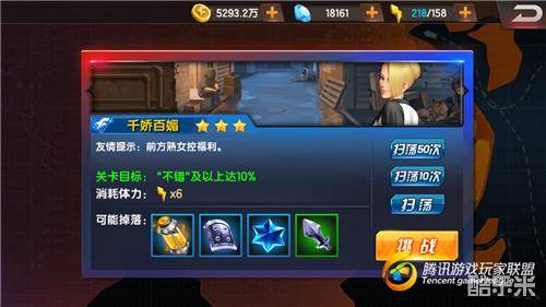 关卡目标是打出“不错”及以上达10%,完全没有难度的挑战任务。千娇百媚关卡总共是三波敌人,第一波三个,第二波两个,第三波麦卓、琼、薇丝。此关卡中的三个BOSS,自身都不是多出色的格斗家,但是强势的单体输出且有特色的残血收割薇丝,想三星通关难度是非常大的。