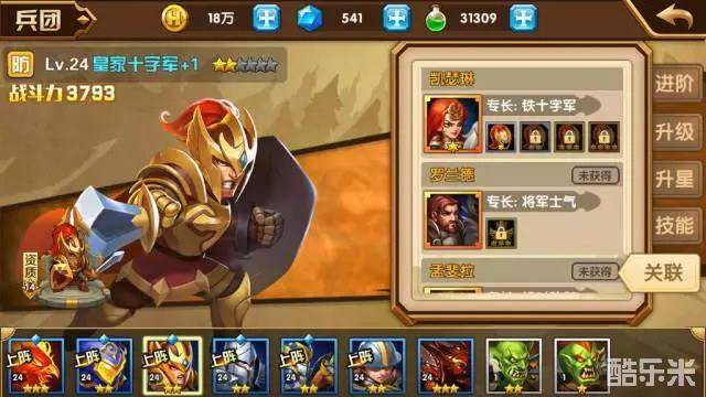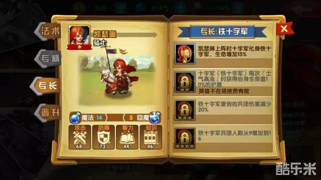 每一个英雄都有自己专属的专长,所以当我们获得一个新英雄时,应当先查看其专长,凯瑟琳的专长为铁十字军,即凯瑟琳与十字军两者一同上阵时,十字军将化身铁十字军并获得强大的增益效果。通过英雄晋升,我们可以提升英雄的星级,其专长也将提供给专属兵团更多更强大的增益,有些增益甚至当英雄不在场时依然有效。所以,在我们选用一个英雄后,上阵其专属的增益兵团是你的不二选择!