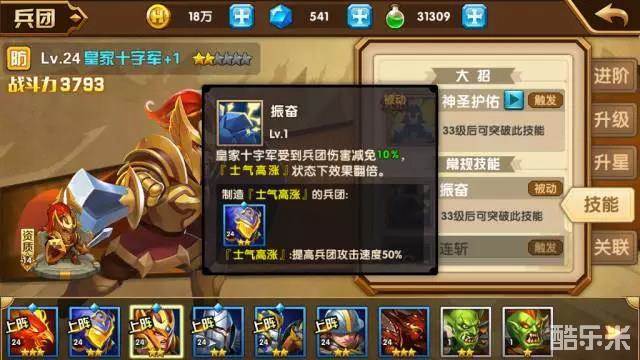 (2)需注意上阵兵团之间的技能搭配效果,例如僧侣可制造『士气高涨』效果,而皇家十字军在『士气高涨』状态下『振奋』技能效果翻倍。