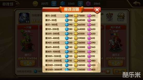 竞技场中每天有5次免费的挑战次数,使用完之后再挑战需要花费钻石购买,VIP级数越高可购买的次数越多。每次挑战成功可以获得20竞技场币,失败则只能获得10竞技币,每天在21:00的时候会根据排名发放奖励,奖励有钻石、金币和竞技币。竞技币除了可以在商店购买物品外还可以根据你的排名兑换一定的奖励。