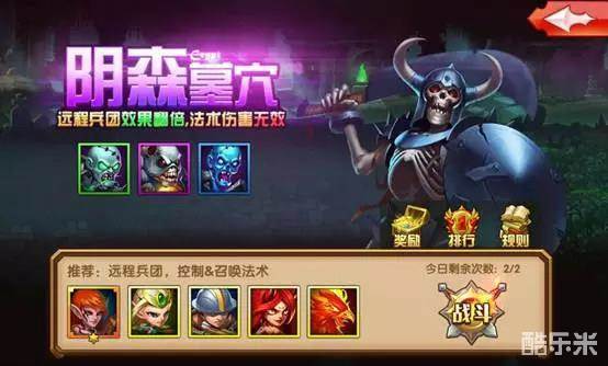 在阴森墓穴中,与矮人宝屋最大的区别就在兵团的选择,远程兵团的效果在阴森墓穴中将会翻倍,但是法术伤害将会无效。所以我们在兵团的选择上自然要优先选择射手和法师,而英雄上可以选择格鲁。格鲁的法术和专长似乎就是为射手度身定做的,在战斗过程中能够为射手提供强大的增益,外加法术无效的缘故,所以也就没有必要选择高爆发的英雄了。