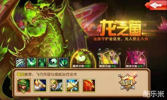 龙之国可以获得图鉴材料、各种等级符石,可以直接提升我们战斗力。这里一共有三条龙可以挑战,周一到周六每天都只有一条龙,周日则是会全部开放。每条龙每天的挑战次数同样是2次,不过这里的挑战设置了难度的选择,每条龙又有着自己的法术和特色——毒龙会对非飞行单位造成大量的伤害;仙女龙会对近战单位产生致命威胁;水晶龙则会对远程目标有威胁。所以我们要根据每一条龙的特色来选择我们出战的英雄和兵团,系统也会提供一些推荐哦!