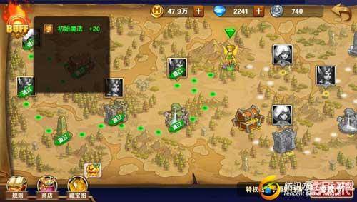战斗过程中玩家会随机遇到竞技场、幸运雕像、魔法泉、魔法学院这些古老遗迹,点击他们能够选择自己想要的战斗增益,如果遇到相同的增益选择,玩家可以选择和上一次一样的增益,效果可叠加,玩家在爵位提升到侯爵之后可以选择第三个以前选不了的增益效果。另外这4种古老遗迹都有几率出现复活效果,玩家可以将一个已经阵亡的兵团复活。