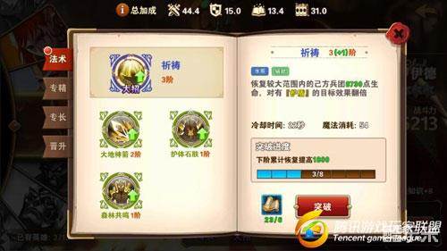 英雄大招祈祷:恢复较大范围内己方兵团生命值,对有【护盾】的目标效果翻倍。