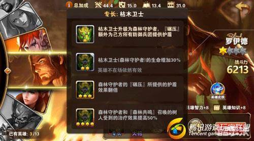 罗伊德的英雄专长兵团是枯木卫士,专长属性加成受到英雄专长星级的影响。