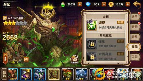 专长1星:枯木卫士升级为森林守护者,技能【碾压】可以额外为己方所有防御兵团提供护盾。