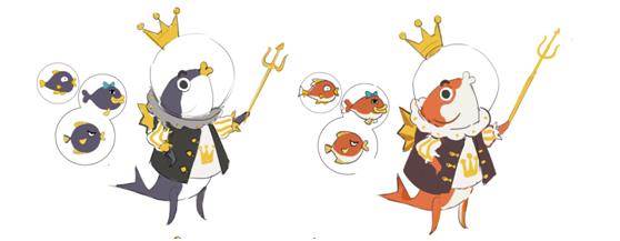 除了咸鱼,以鱼为本体的另一个反转梗便是锦鲤,于是开发组大开脑洞,将原本的咸鱼思路进行了调整:在保证了鱼本体设计的情况下,加入皇冠等高贵身份的元素,让整体角色搞笑且鲜明;最后,设定上配以【本大王就是锦鲤】的自恋人物性格,咸鱼配皇冠,中二又呆萌的灵感大王就此诞生。