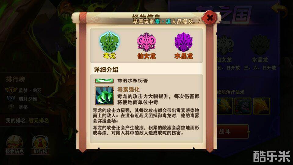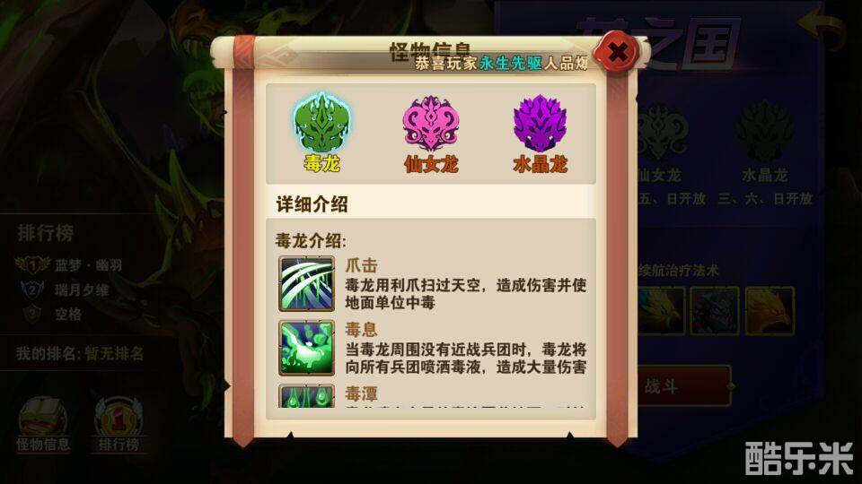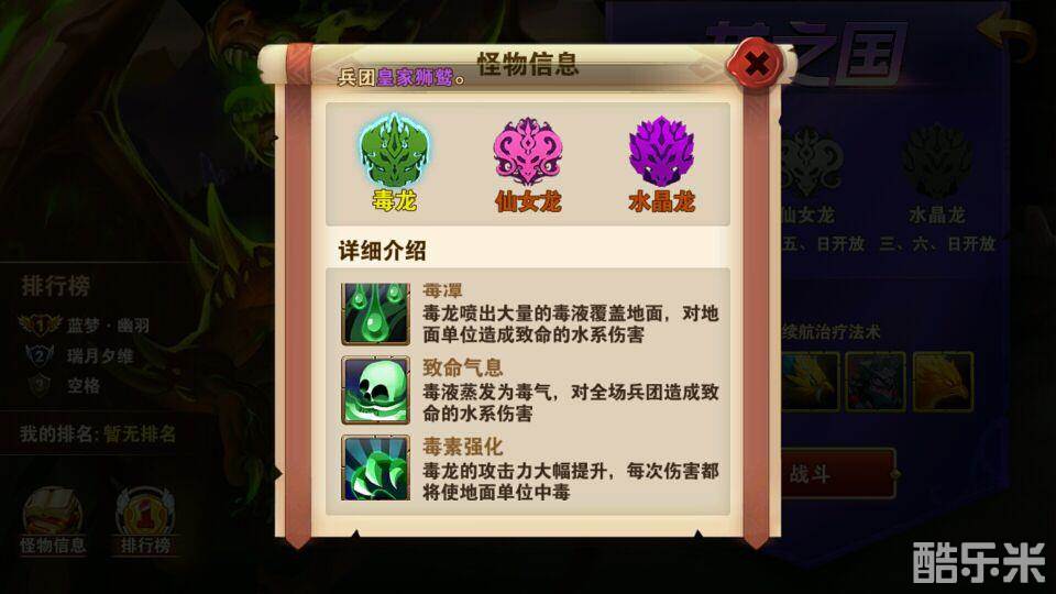要想过关龙之国,首要的任务就是研究怪物的技能,你只有针对怪物的技能去放置相应的兵团,这样你的过关几率才会更高。例如毒龙的攻击特性,在没有近战兵团抵御毒龙时,他的毒雾就会弥漫全场,对场上所有的兵团造成打击。在这种情况下,你就需要摆放近战兵团进行牵制,尽可能的减少他对于军团的损伤,从而增加你的过关几率。