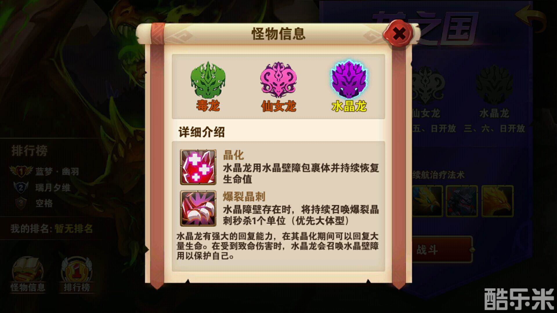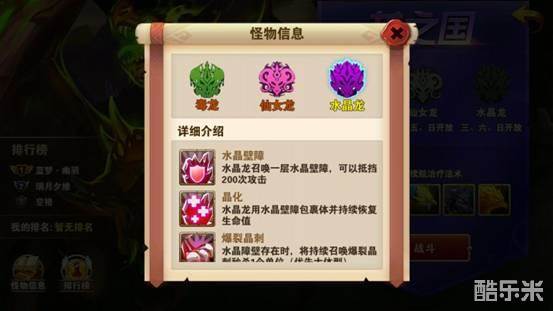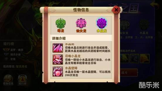 征服龙之国,是很多玩家的梦想。要知道,从目前的游戏进度来看,龙之国可以说是为数不多比较困难的玩法。就连最简单的模式,如果不是认真搭配兵团,或者是硬件实力不达标的话,你想过关都是比较难的。而在本期攻略中,我将给大家分析一下水晶龙困难的的过关玩法,同时也会给大家详细介绍一下boss的能力和基本的兵团搭配,让大家在玩的时候可以少走一些弯路。