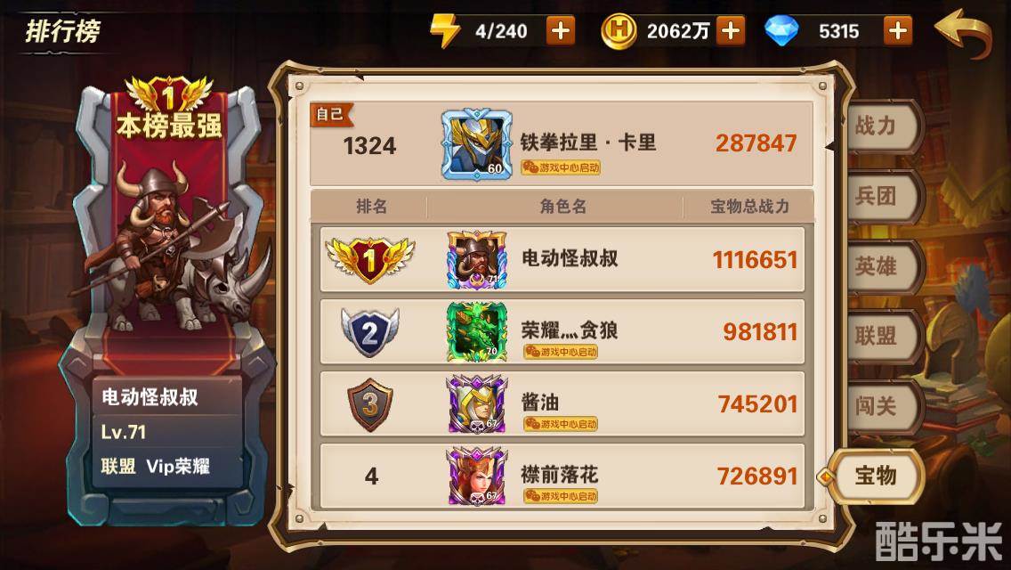 另一个每天消耗钻石的主要方面就是宝物五连抽,在前期宝物的作用可能还不是很明显,但是越到后期差距越大,同样的两组兵团在两个持有不同宝物的玩家手里,效果天差地别。宝物的优势在于是全兵团的增益,与你选择的阵营是无关的,比如中期选择的是地狱阵营,后期转塔楼或者墓园,这时之前培养的地狱兵团就进了仓库了。但是宝物却是不分阵营,为全部兵团增益的,所以越到后期,宝物的作用越大。从排行榜上我们可以看到,总战斗力两百多万的高玩,其中有一百多万的战斗力都来自于宝物,宝物对于战斗力的提升可见一斑。