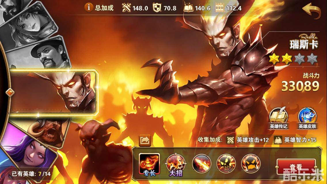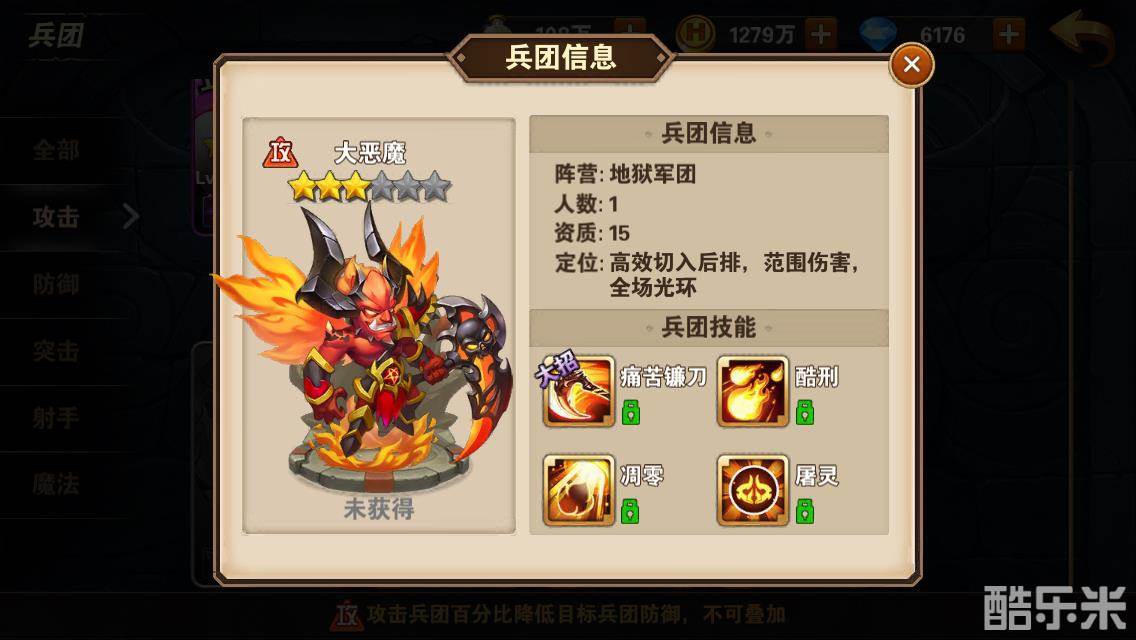另一个能享受灼烧效果的就是大恶魔了,技能酷刑能同时攻击3个敌方兵团,技能组合生效的概率相对而言还要大一些。烈火精灵的大招烈火风暴是范围攻击,而不局限于某个兵团,所以将前排尽可能的集中起来,一方面能最大化烈火精灵的大招伤害,另一方面也最大化了灼烧覆盖的范围,烈火精灵大招15秒的持续时间还是不错的。