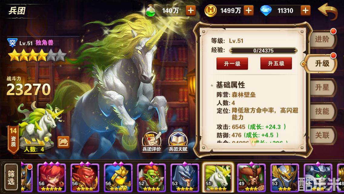 只考虑自己,不考虑队友又怎么称得上是团队的领袖呢?强光和失明术就是独角兽自带的团战群体增益技能。众所周知的是,突击兵团在使用中往往是摆成一字长蛇阵破防的,而且自身属于高攻低防的兵种,在与敌方前排兵团的纠缠中,对攻时间越久对突击兵团越不利。失明术大幅降低当前攻击兵团所在横排的命中率,这就是直接降低了敌人的伤害,间接的提高了突击大军的生存率。强光更是破防利器,可以提高受失明术影响的目标受到的兵团伤害,在如潮水般涌来的突击大军面前,这将是极为致命的一击。